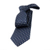 Saybrook Foulard is a striking medallion silk tie, featuring a rich, repeating silver & light blue floral-like pattern set against a deep navy background with a subtly textured weave.
